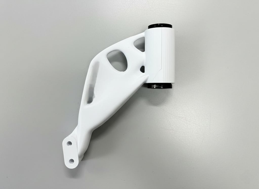 La pince, d'une longueur de 700 mm, a été fabriquée par impression 3D en utilisant plusieurs matériaux (PLA-HI, PETG et TPU) au fil de différentes itérations, notamment pour perfectionner le système de rotule des transducteurs.
